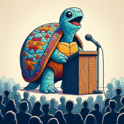 At 10:30, Guild President Donna Phillips will hold an informal workshop to teach you how to make her chosen President’s Block. She will provide the sashing pieces. You provide a 10-inch square of an allover fabric in your favorite color(s). Because part of the block is flipped, your 10-inch square CANNOT be directional. Donna is also asking that it not be representational (no flowers, animals, or gadgets). Go for the abstract or geometric in colors you love. Show Donna your appreciation for her hard work as President and make her a block.